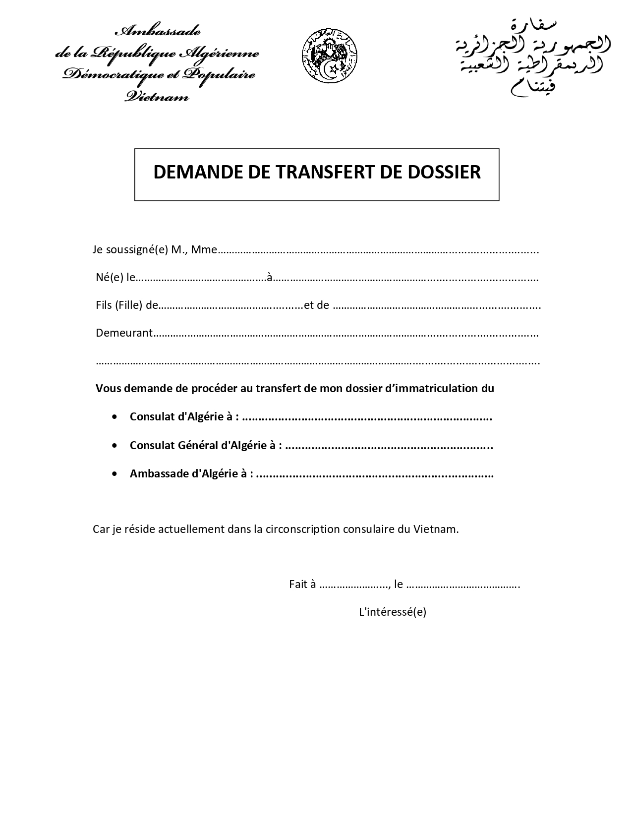- Le formulaire de demande de transfert de dossier (ci-joint) dûment rempli, daté et signé.