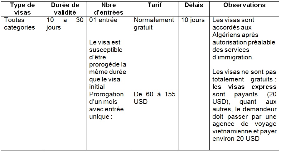 Pour venir au Vietnam un visa est nécessaire et il est délivré gratuitement aux citoyens algériens, au prés du service compétent de l’Ambassade du Vietnam en Algérie.
